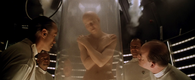 Ripley must come to terms, not only with being brought back to life into yet another future world environment that is not her own, but also with the fact that she is no longer herself. The alien has won. It has a hold on her, at a molecular level, from which she can never hope to escape. Whedon ensures that Ripley has some fun with her predicament - giving her superhuman strength and dexterity, not to mention acid for blood and an uncanny sixth sense that can "feel" the other aliens. He even forces her to confront a roomful of less successful incarnations of herself, each displaying her new hideous cross-species identity in more monstrous, crippling detail. The film also makes Ripley deal with this new development in her relationship with the alien on a profoundly human level. Her foe is also her child now, her own flesh and blood, and in the film's grand finale this tangled relationship becomes even more complex, as Ripley and the queen consummate their 18-year courtship with the birth of their own incestuous offspring. By producing a monster of her own, she has become both the enemy and its protector.