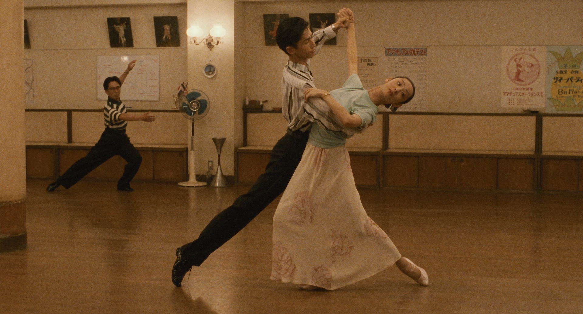 The woman is Mai Kishikawa (Tamiyo Kusakari), a renowned ballroom dancer, and the studio is used for dance lessons. On a whim, Sugiyama enrolls. At first, it's his passion for her that propels him, but he soon finds that dance itself excites and enthralls him. Keeping his new passion secret from his family and co-workers, an artistic affair begins.